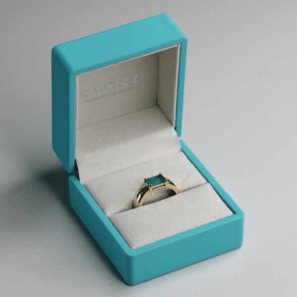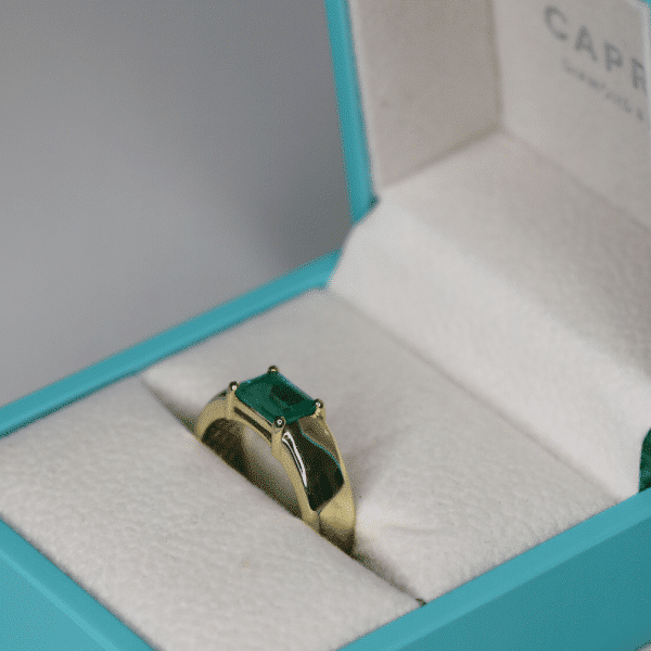 עשויה 14 קראט זהב צהוב, בשיבוץ אבן אמרלד בצורת אמרלד, במשקל 1.3 קראט.