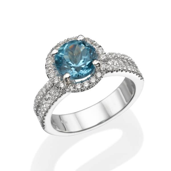 טבעת 14 קראט זהב, בשיבוץ אבן בלו טופז במשקל 2.71 קראט ובעיטור 82 יהלומים במשקל כולל של 0.73 קראט.