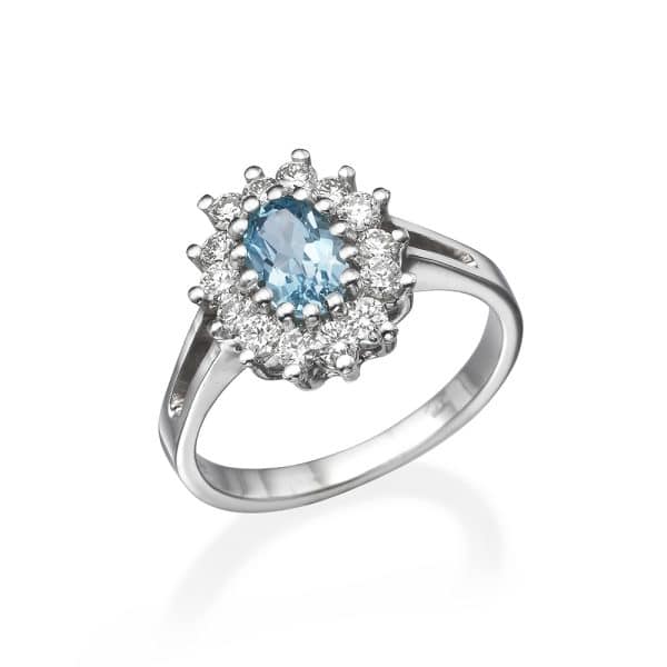 טבעת 14 קראט זהב, בשיבוץ אבן בלו טופז במשקל 0.92 קראט ובעיטור 14 יהלומים במשקל כולל של 0.59 קראט.