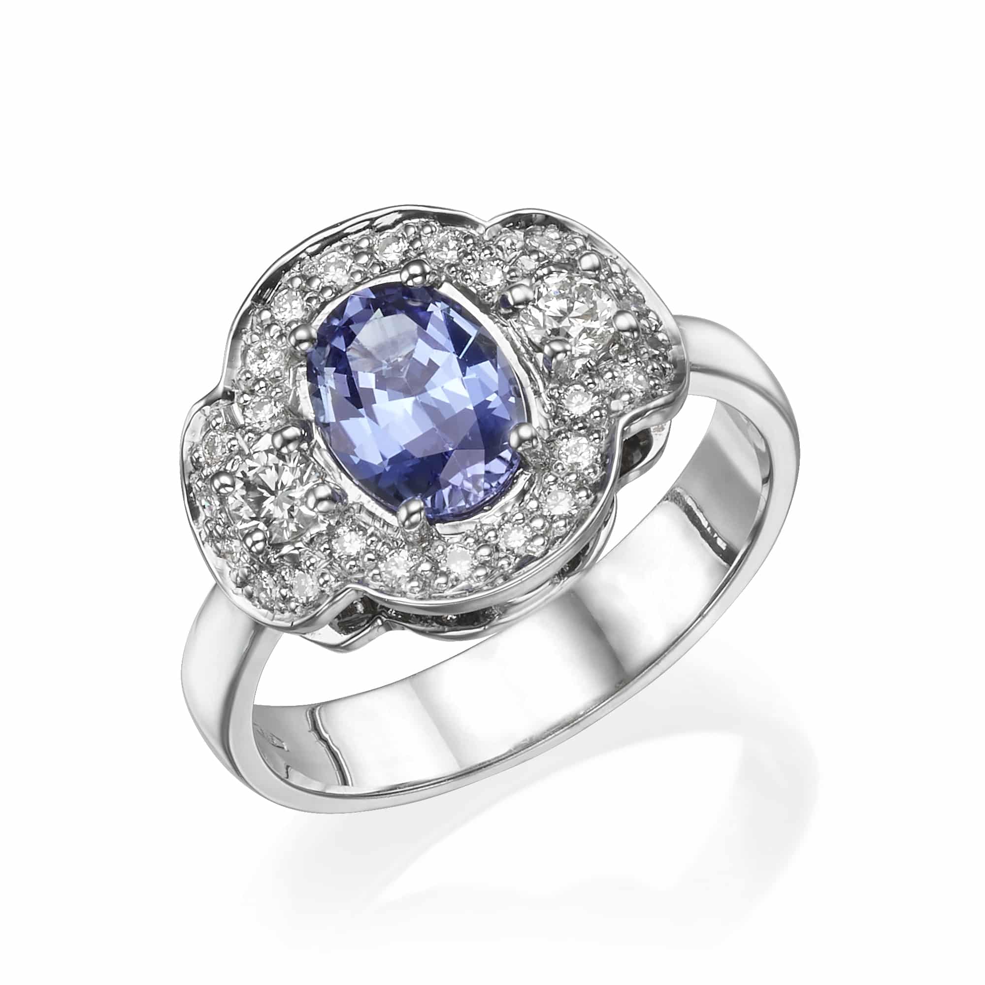 טבעת, 14 קראט זהב לבן, משובצת באבן טנזנייט במשקל 1.35 קראט ובעיטור 0.41 קראט יהלומים.