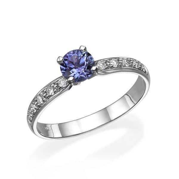 טבעת 14 קראט זהב, משובצת באבן טנזנייט בחיתוך עגול, במשקל 0.65 קראט ובעיטור 10 יהלומים במשקל כולל של 0.17 קראט.