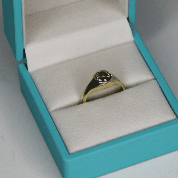 עשויה 14 קראט זהב צהוב, בשיבוץ יהלום עגול פנסי בצבע חום, במשקל 1.04 קראט.