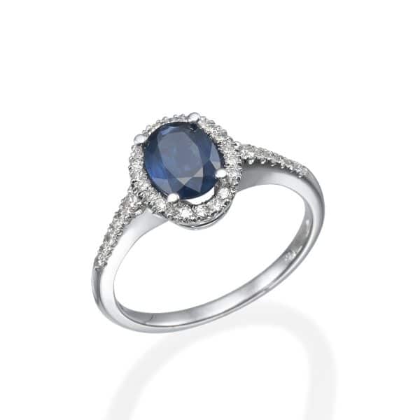 טבעת 14 קראט זהב לבן, משובצת באבן ספיר בחיתוך אובל, במשקל 1.15 קראט ובעיטור של 0.33 קראט יהלומים.