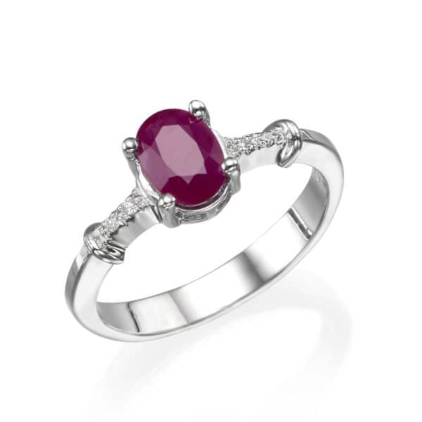 טבעת, 14 קראט זהב, משובצת באבן רובי, בחיתוך עגול במשקל של 1.04 קראט ובעיטור 12 יהלומים במשקל כולל של 0.06 קראט.