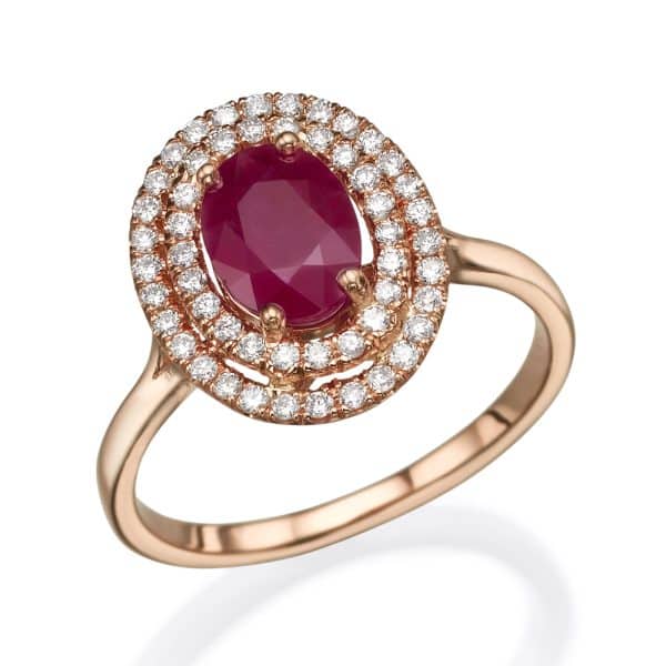 טבעת 14 קראט זהב בעיצוב אלגנטי ומלא נוכחות, משובצת באבן רובי טבעית בחיתוך אובל מרהיב במשקל 1.45 קראט.האבן המרכזית מוקפת בעיטור של יהלומים לבנים במשקל כולל של 0.32 קראט, המעצימים את הברק והעומק של גוון האדום העשיר. שילוב מושלם בין יוקרה קלאסית לאצילות נצחית – טבעת שמספרת סיפור של אהבה ותשוקה.