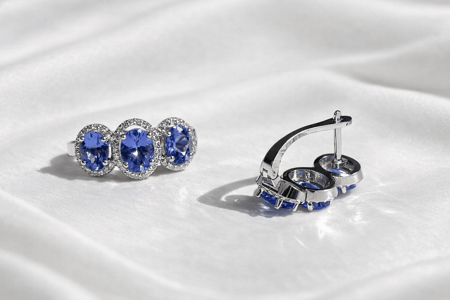עגילי 14 קראט זהב, משובצים ב 3.85 קראט אבני טנזנייט בעלות צבע עמוק ונוכח ובעיטור 0.51 קראט יהלומים.