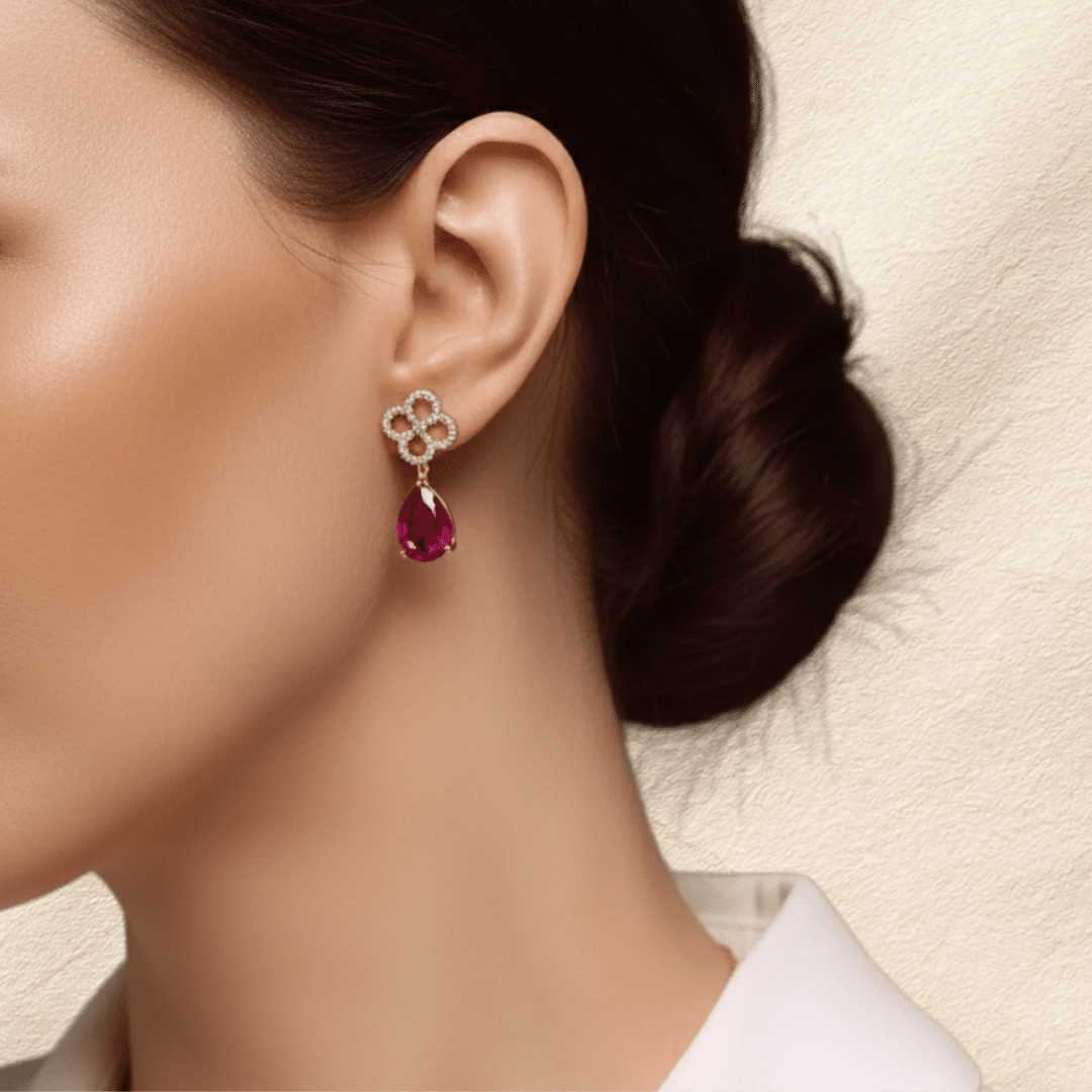 עגילי 14 קראט זהב, משובצים באבני טורמלין בגוון וורוד במשקל 6.00 ובעיטור 0.42 קראט יהלומים