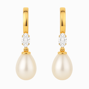 עגילים בעיצוב אלגנטי וייחודי, 14 קראט זהב, בשיבוץ 0.08 קראט יהלומים וזוג פנינים.