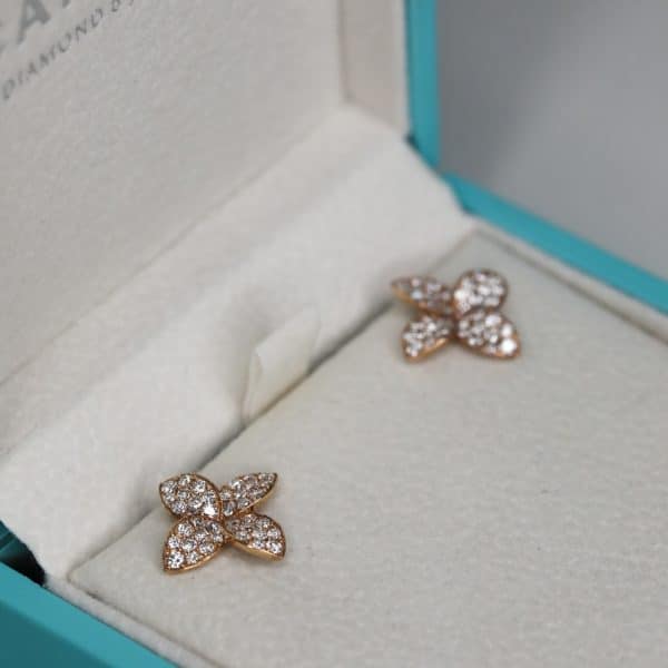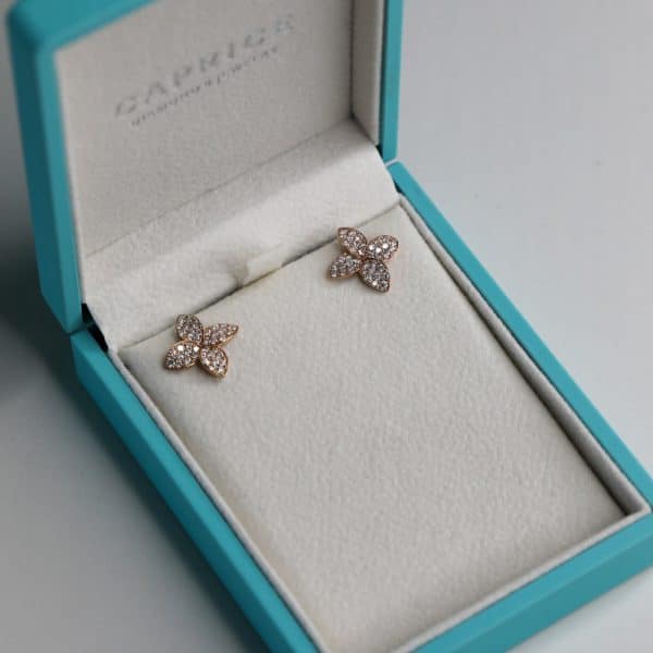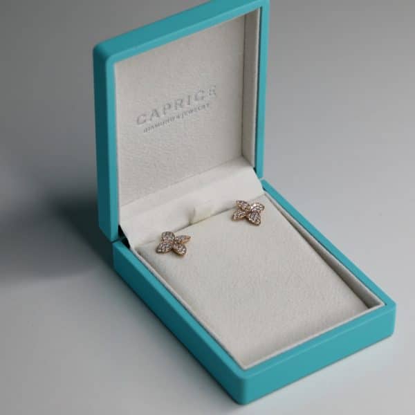 עגילים אלגנטיים בעיצוב פרח בעל ארבעה עלי כותרת, משובצים ביהלומים נוצצים.