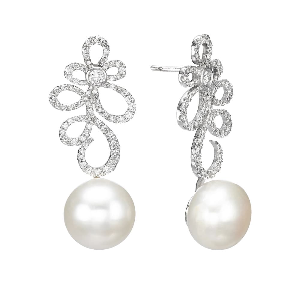 עגילים, 14 קראט זהב, בשיבוץ זוג פנינים מרהיבים ו1.15 קראט יהלומים.