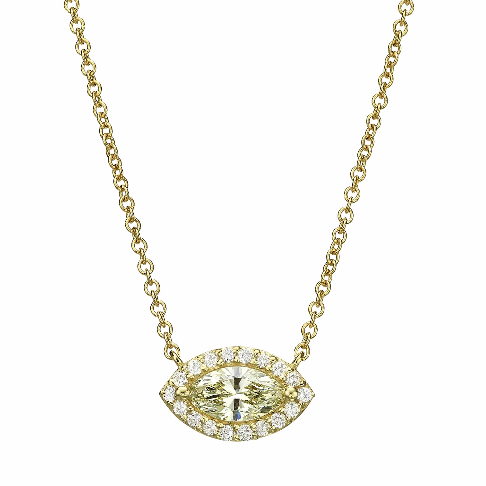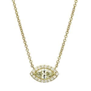 שרשרת 14 קראט זהב צהוב, בשיבוץ יהלום מרכזי בחיתוך מרקיזה, במשקל 0.50 קראט ובעיטור 0.14 קראט יהלומים.
