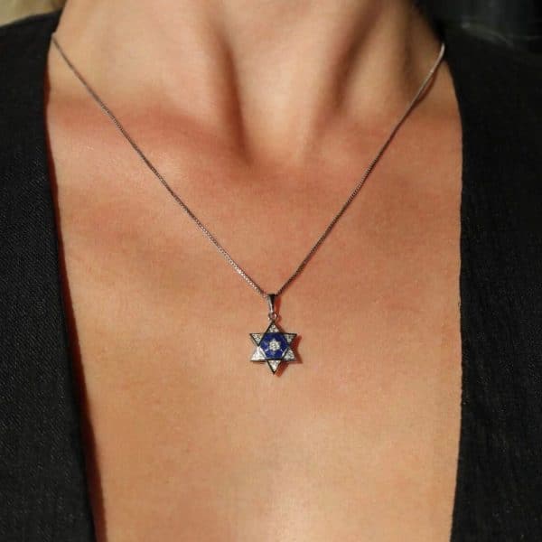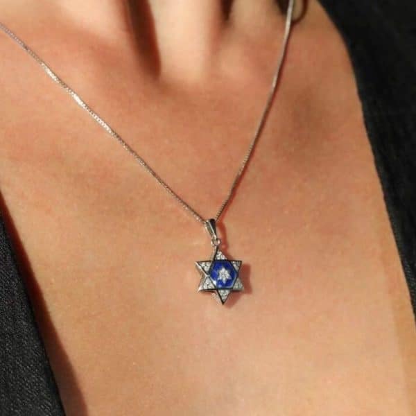 תליון ושרשרת בעיצוב מגן דוד עם נוכחות מיוחדת שנותנת אור וברק, 14 קראט זהב צהוב וציפוי אמייל כחול, משובץ ב- 0.12 קראט יהלומים.