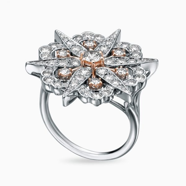 טבעת כוכב מדהימה, 18 קראט זהב, בשיבוץ יהלום מרכזי במשקל 0.18 קראט בעיטור 1.10 קראט יהלומים.