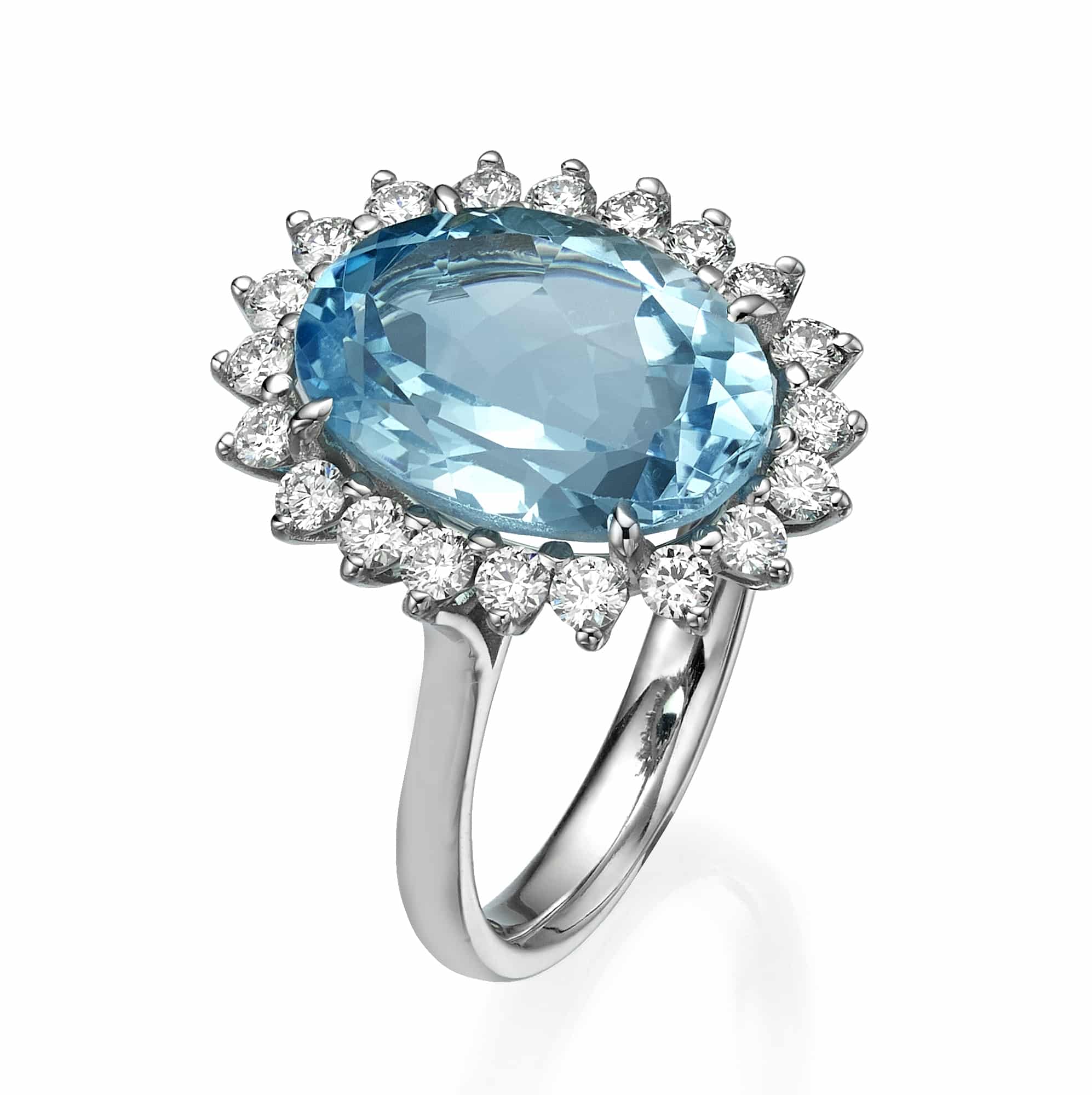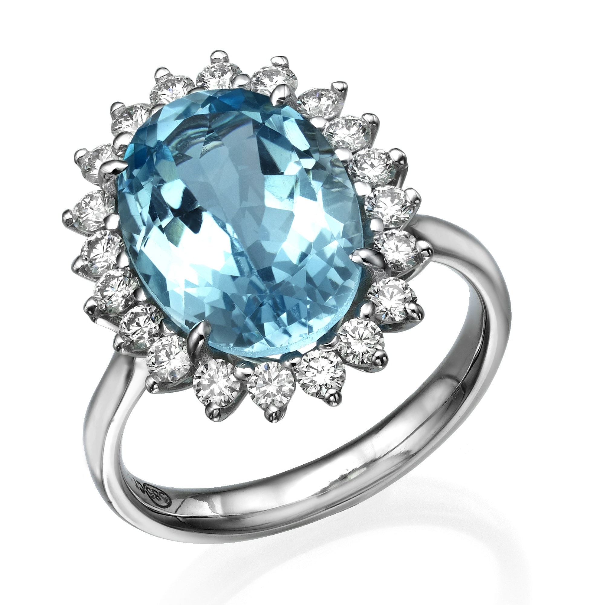 טבעת 14 קראט זהב לבן, בשיבוץ אבן בלו טופז במשקל 6.75 קראט ובעיטור 0.71 קראט יהלומים.